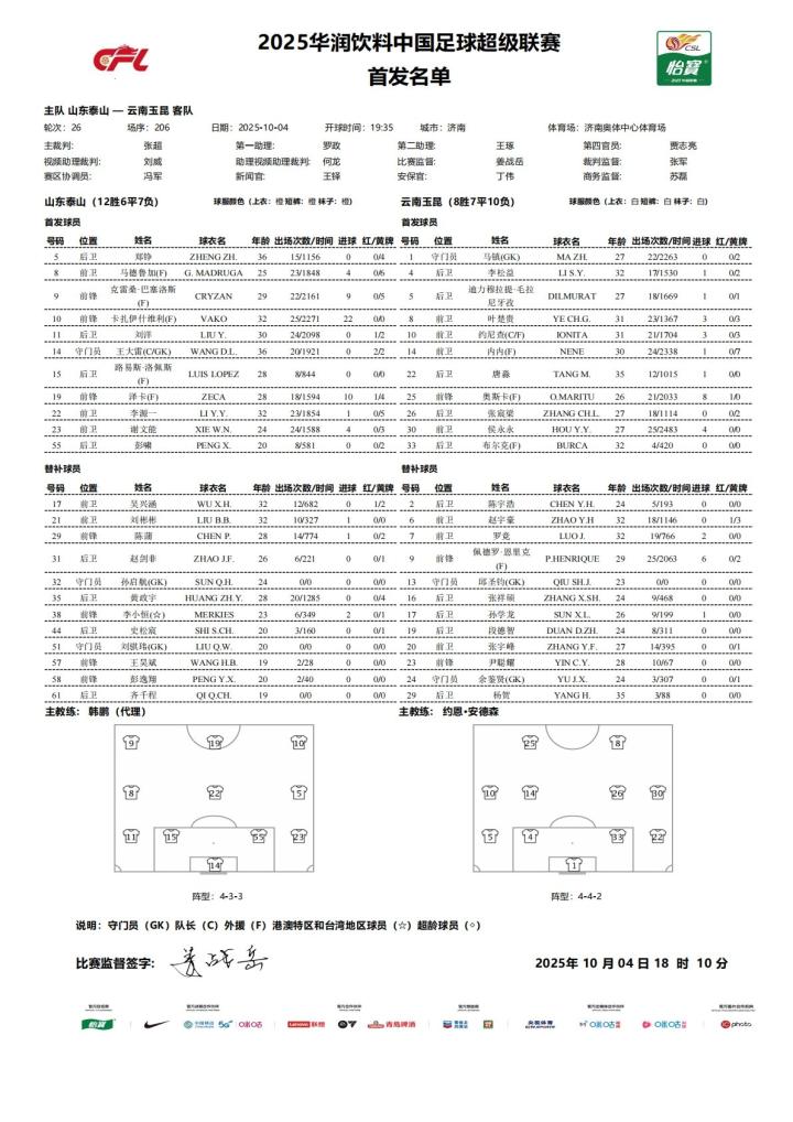 北京时间10月4日19:35,中超第26轮焦点战在济南奥体中心打响,山东泰山坐镇主场迎战云南玉昆。随着主裁判一声哨响,这场备受瞩目的对决即将拉开帷幕,双方赛前公布的首发名单已引发球迷热议: